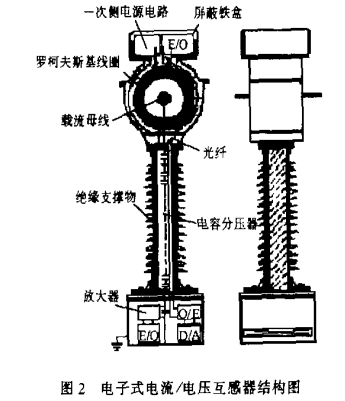 電流互感器設備由電流檢測單元和電壓檢測單元兩部分組成。前者選用羅柯夫斯基線圈作為電流傳感器,有源電子器件完結(jié)信號的數(shù)宇調(diào)制;后者選用電容分壓器作為電壓傳感器。高壓端電子線路電源由-一個輔佐電源感應線圈直接從母線上獲取。羅氏線圈和電源感應線圈安裝在母線上。高壓端信號調(diào)制和電源調(diào)理電路板置于·一個鐵磁屏蔽盒中,電流信號在高壓端經(jīng)AD改換、E/O改換后調(diào)制成光信號,通過光纖傳送到低電位端。根據(jù)需求,能夠?qū)⑿盘柍掷m(xù)用光纖傳送到遠方的控制室,也能夠就地經(jīng)O/E、D/A改換,放大成模仿電流信號,母線電壓經(jīng)電容分壓器改換成低壓信號后,調(diào)制成光信號,經(jīng)光纖傳送到控制室,也能夠就地經(jīng)校準、溫度補償后,給出模仿電壓信號、一個陶瓷套管既用作高壓部分元件的絕緣支撐,一起又是傳輸電流信號的光纖和電容分壓器的通道。