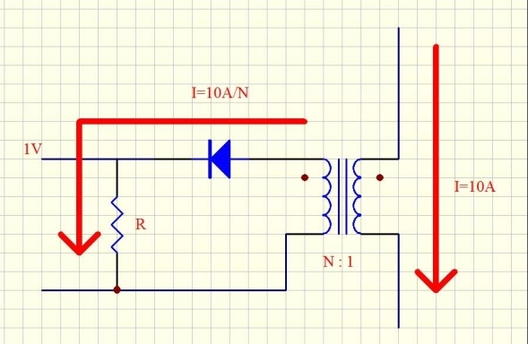 假定用電流互感器檢測變換器的原邊電流,原邊10A電流對應(yīng)1V電壓。當(dāng)然,我們可以用一個1V/10A=100mΩ的電阻來檢測,但是電阻將構(gòu)成的損耗為1V×10A=10W,這么大的損耗對簡直一切的規(guī)劃來說都是不能接受的。所以,要選用電流互感器,如圖1所示。