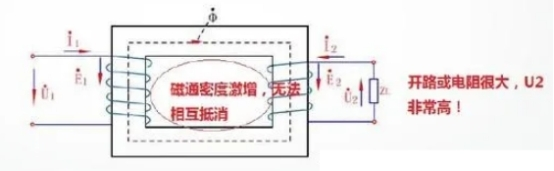 電流互感器在正常作業時,它的一次磁勢與二次磁勢是彼此均衡的。一旦二次側開路,二次電流等于零,一次線圈的電動勢堅持不變,一次電流悉數成為勵磁電流,這將引起鐵芯中磁通量Φ急劇上升,這個急劇上升磁通量或許引起鐵芯磁飽或許或許在二次側感應出較高的電壓。